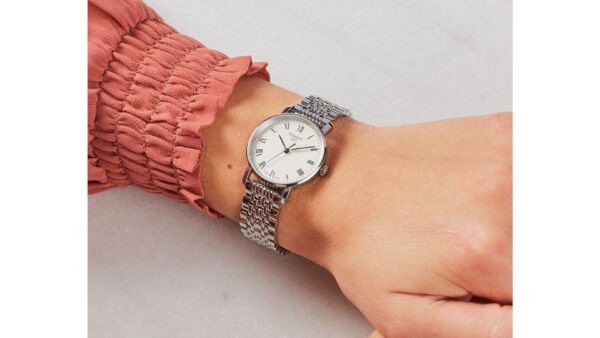Integra reloj de caja de acero de 30 mm con cristal de zafiro, movimiento de cuarzo suizo calibre ETA 902.101, indicador de fin de vida de la pila, y resistencia al agua hasta 3 atm (30 m).