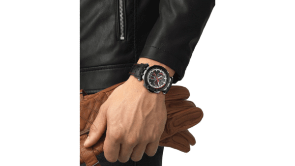 Integra cronógrafo suizo alimentado por cuarzo con indicador de fin de batería (EOL), función de 1/10 segundo y contador de 30 minutos, escala taquimétrica en el bisel y hermeticidad hasta 100 metros