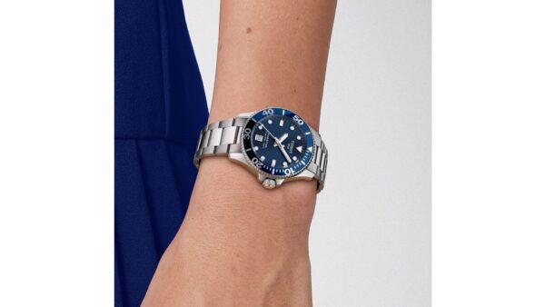 Integra movimiento de cuarzo suizo, caja de acero de 36 mm con corona y fondo atornillados, cristal de zafiro antirreflectante, bisel giratorio unidireccional y resistencia al agua hasta 30 bar (300 m).