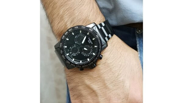 Integra cronógrafo suizo de cuarzo con función de 1/10 s, taquímetro, indicador EOL de batería, tres subesferas (60 s, 30 min, 1/10 s), fecha, resistencia al agua de 100 m y cristal de zafiro irrayable