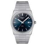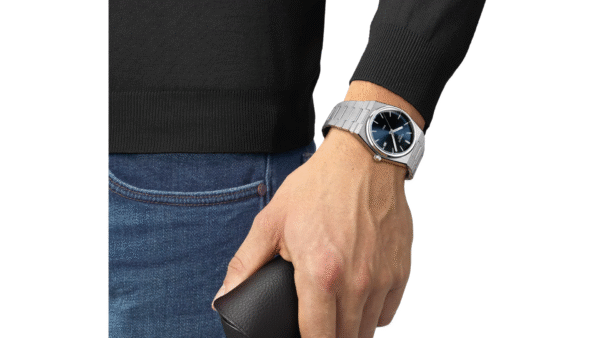 Integra movimiento ETA F06.115, función de fecha, cristal de zafiro, caja de acero de 40 mm, resistencia al agua hasta 100 m y diseño retro-integrado estilo años 70