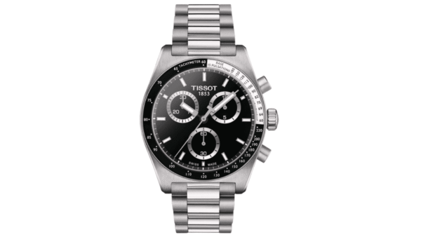 Integra movimiento de cuarzo suizo con indicador de fin de batería (EOL), cronógrafo con contador de 30 minutos, 1/10 segundo y aguja central de 60 segundos, así como escala taquimétrica y resistencia al agua de 100 m