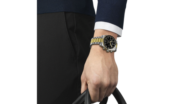 Integra cronógrafo (contadores de 30 min y 1/10 s), movimiento G10.212, bisel taquímetro, cristal de zafiro antirreflectante, caja de acero 316L de 40 mm con recubrimiento PVD oro y estanqueidad hasta 100 m