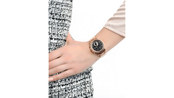 Integra movimiento de cuarzo, visualización de día, fecha y hora en formato de 24 horas, cristal mineral resistente y resistencia al agua de 30 metros, combinando funcionalidad con diseño elegante
